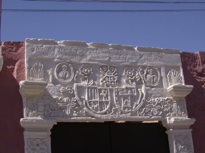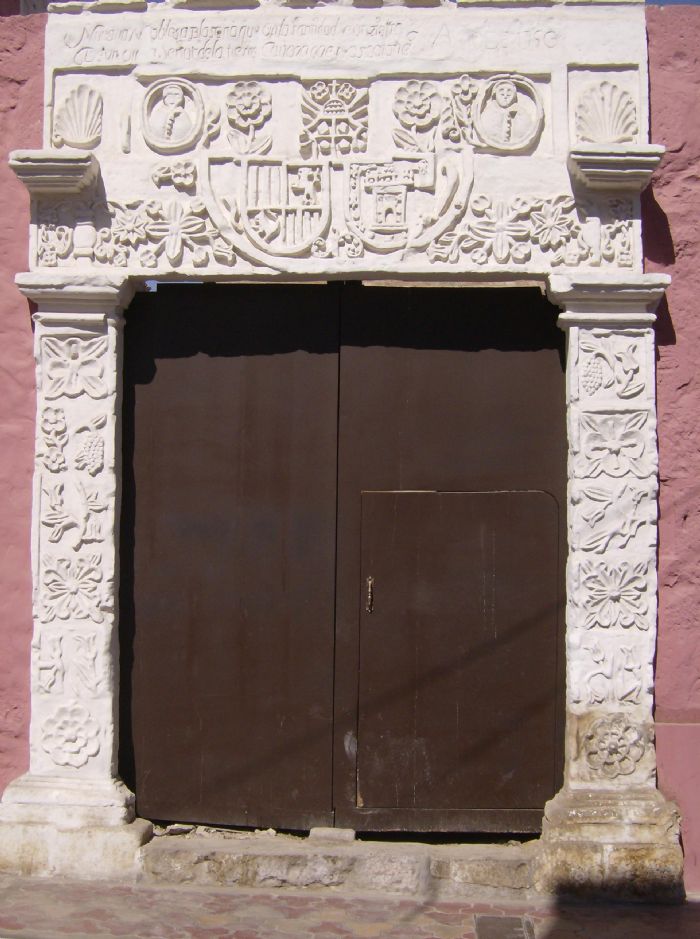 Las dos pilastras que posee esta portada, tienen bases de piedra labrada, con fustes rectos de forma ortogonal de forma continua, unidas con mortero de cal proyectado al final por un capitel muy simple. Encima de estas se ve un entablamiento partido muy bien labrado, a los extremos vemos dos capiteles proyectados al mismo eje de sus fustes. Rematando este conjunto una moldura labrada.