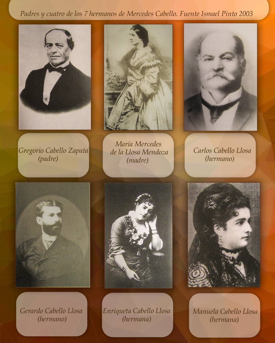 Juana Mercedes Cabello Llosa, nace el 17 de febrero de 1842 en la ciudad de Moquegua, fecha confirmada por el investigador-periodista Ismael Pinto Vargas, al tener acceso a la partida de bautizo, ya que en diferentes publicaciones acerca de su biografía se consignan distintas fechas. Los padres de Mercedes fueron, Gregorio Cabello Zapata y doña María Mercedes de la Llosa Mendoza, tuvo 7 hermanos, David, Gustavo, Carlos, Gerardo, Cristina, Enriqueta y Manuela, siendo ella la quinta en orden de nacimiento.