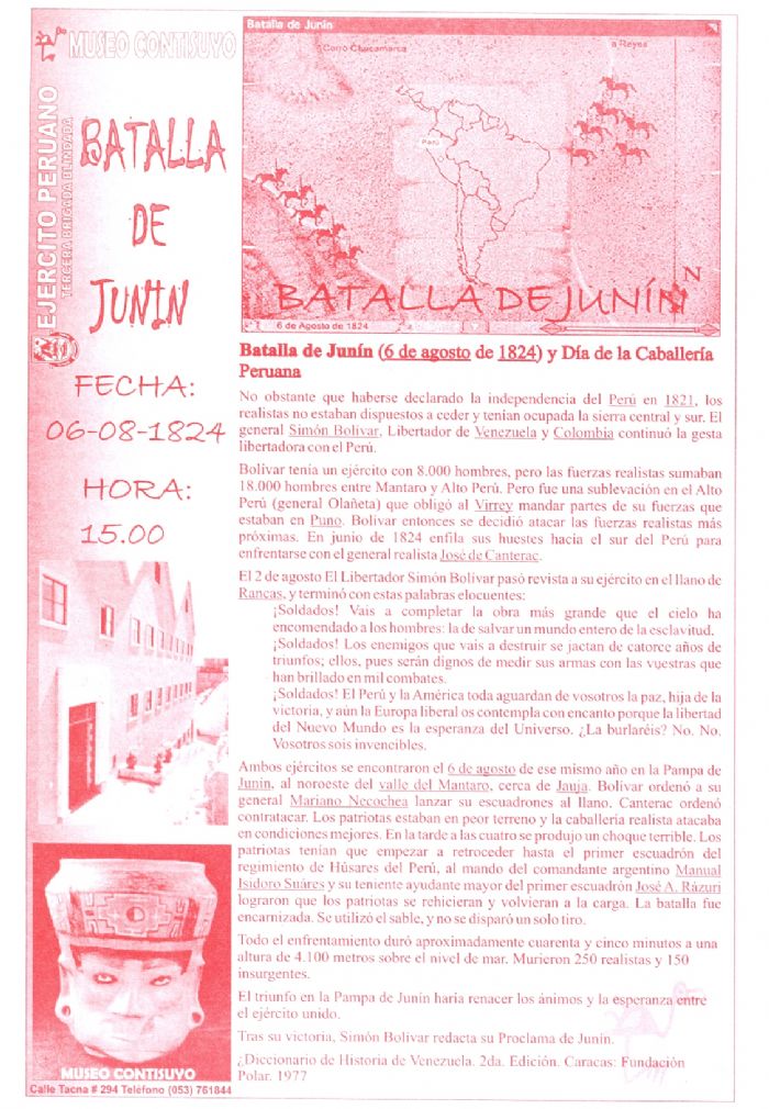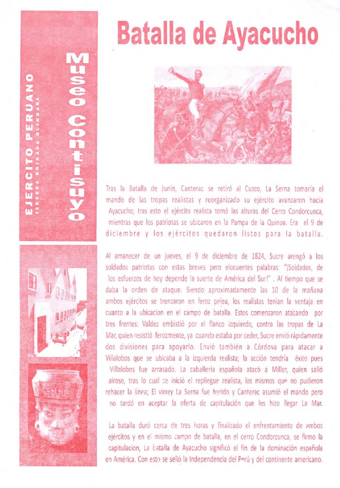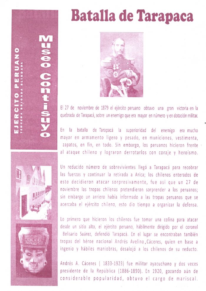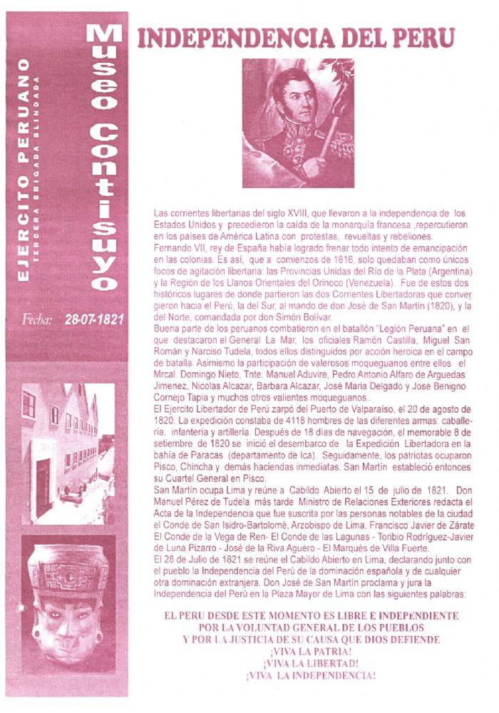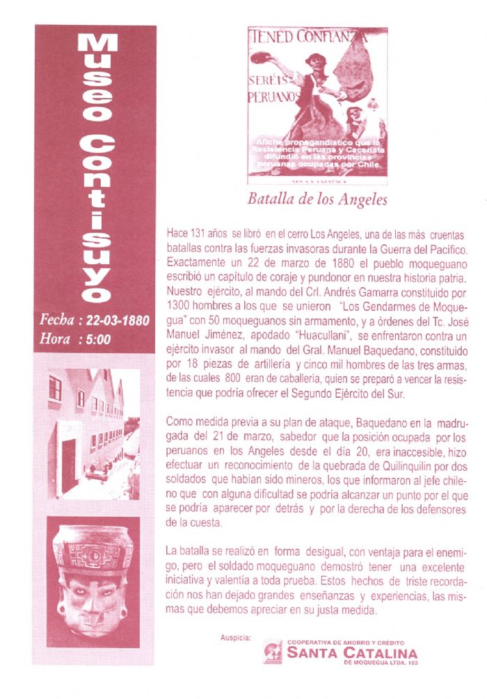 La campaña consiste en editar un texto por cada acontecimiento histórico y son distribuidos por varios millares, de domicilio en domicilio, para que la población conozca cómo fueron  las batallas de Ayacucho, Junín, Tarapacá, Los Angeles y Arica entre otras, que nos llena de ejemplo de identidad, entrega, y solidaridad para que la población sepa, conozca y valore su tierra y su historia en la vida diaria, para que su orgullo y dignidad nunca decaiga.